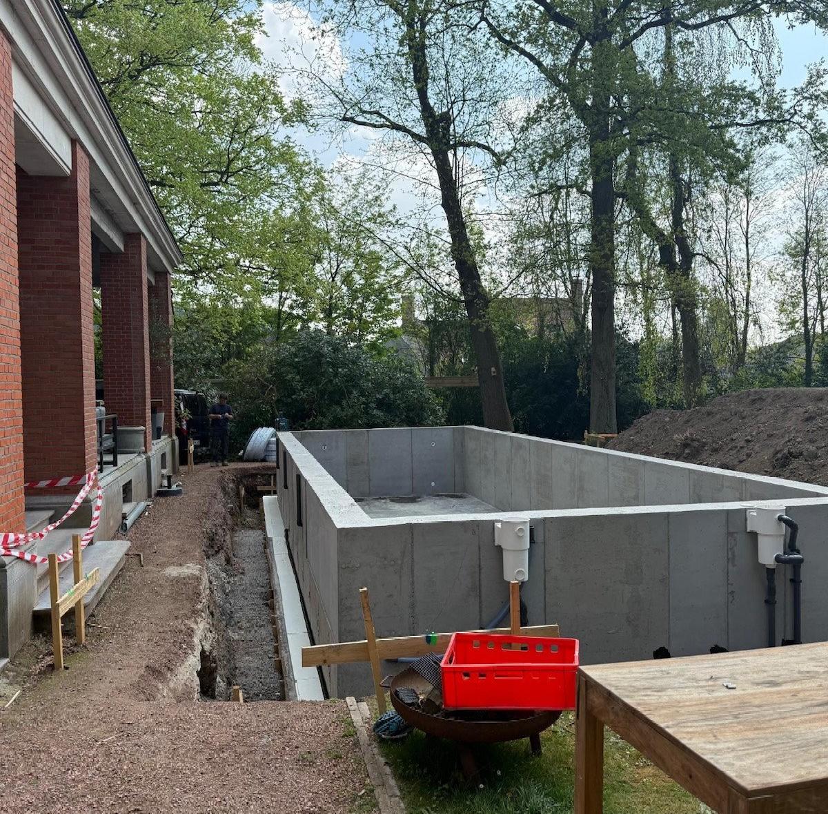 De betonnen kuip werd ter plaatse gegoten, waardoor we maximale stabiliteit, duurzaamheid en waterdichtheid konden garanderen. Elke fase—van grondwerken en bekisting tot wapening, storting en afwerking—werd uitgevoerd met oog voor detail en volgens de hoogste kwaliteitsnormen.